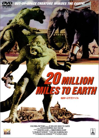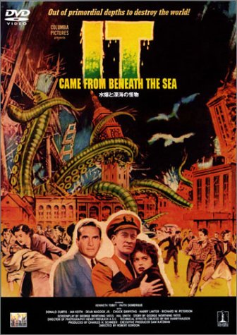 | 北太平洋航行中の船が遭難した。救助された乗組員によると、巨大な怪物に襲われたと言う。乗組員の言葉を人々は信じなかったのだが、唯一それを信じて調査する海軍のピート中佐は、これが太平洋における過度の水爆実験により、巨大化した深海のタコが、食物を求めて出現したのだ。と言う確信を得る。そしてとうとうサンフランシスコに上陸する巨大タコ… 『原子怪獣現わる』(1953)に続くハリーハウゼンによるモデルアニメーション作品。テーマおよび物語はまさに『原子怪獣現わる』そのまんま(つまりは『ゴジラ』(1954)と同じと言うこと)なのだが、出てくるモンスターがタコというのが特徴。タコというのは英語でdevil fishと呼ばれる位だから、欧米人には生理的嫌悪を及ぼす存在らしく、多くのパニック映画で用いられているが(東宝の『フランケンシュタインの怪物 サンダ対ガイラ』(1966)の海外ヴァージョンではラストに大ダコが現れてるのもその配慮か?)、やはりタコと言えば、これに尽きる。 モデルアニメーションで動くタコは予算の都合で6本脚になってしまったそうだが、それを感じさせないダイナミックな動きは特撮ファンには感涙もの。ゴールデンゲート・ブリッジに巻き付くあの脚の描写を見よ!二本脚怪獣には到底見られない複雑な動きを見事に演出してくれていた。 ああ言うねばねばしたものが画面一杯に出てくるのが恐怖の対象となるのは、納得できるなあ。 ストーリー展開はまあベタベタっぽいし(ロマンスを絡めて危機で絆が強まるってのはアメリカらしい)、タコの最後がちょっとあっけない感じも受けるが、力一杯“頑張ってますよ”って主張が演出面で見られるので、それでOKって感じ。 |