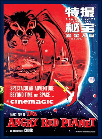| 61日間連絡を絶っていた世界初の火星探査ロケットが地球に帰還した。だが4人いた隊員も生存者は僅かに2人。しかも隊長であるオバニオン大佐(モーア)は奇妙な肉腫に冒されていた。残った女性隊員アイリス(ヘイデン)が語ったのは、火星での恐ろしい体験談だった… B級SF作品の監督や脚本(後に小説家に転向)を手がけるメルキオール監督のデビュー作。製作期間は僅かに10日と言う極端な早撮りで作られた作品ながら、実に魅力的なSF作品に仕上がっている(特に怪獣好きな人間にはつとに有名)。 物語の構成はエンカウント→逃げる→エンカウント→…と言う、次々と現れるモンスターにどう対処するか。と言う古典的且つ、アニメ的な演出だが、結構これが心地良い。ストーリーは二の次で、怪獣をどう演出するかに特化してる点が大変よろしい。 最初に登場するのが食肉植物。触手を揺らめかせながら登場人物を絡め取り、本体に引き寄せてくる。ただ、引き寄せられたからすぐに食われるのか、と言うとさにあらずで、捕まったキャラクターは叫んで暴れるだけ。こいつは超音波銃で撃退。 次はいよいよお待ちかねのコーモリグモ。最初立木だと思って枝を切ったらいきなり暴れ出す。なんと身の丈40フィート…って、12メートル?そんなに小さかった?だったら上見りゃすぐに分かっただろうに。気付けよ!こいつも例の超音波銃をばしばし撃ち込んだら、目を潰されて退場(しかし文字通りコウモリとクモを合わせたようなこのデザインは今見ても素晴らしい)。 そこで帰ろうとするが、特殊な力場が宇宙船の周りに張られていて帰還を果たせず。 その後、性懲りもなくまたまた探検に出かけると、そこには湖があり、ゴムボートを出してえっちらえっちら漕いでいくと、そこには何と超近代的な都市が!…火星に水あったりそんな都市を今までどうして見つけられなかった?とか、どう見ても立体感のない書き割りの都市だとかは言ってはいけない。そして湖を割って登場する表題の巨大アメーバ。肉まんみたいなのの上に一つ目がぎょろぎょろ回る奴で、大急ぎで逃げる隊員を取り込んでしまい、更にロケットにまとわりつく。こいつは宇宙船に電流を流すことで撃退…宇宙船の周りに電流を流すって、凄い用意が良いよな。 そしてついに姿を表した目を三つ持つ火星人の声が響く。「地球人は戦争ばかりしてる好戦的な種族だから、もう火星には来るな」と言う…だったら最初っから言ってれば良かったんじゃないか? …言わば、アラしかない作品なんだけど、だからこそ魅力がある作品というのも確かにあるんだ。改めてそれを感じさせられた。 ただ一つ文句を言わせてもらうと、舞台が火星だから、赤いフィルターをかけて撮影してるので、全部観終える頃には目が無茶苦茶疲れると言うところか。本作をご覧になる方がおられたら、充分注意されたし。 |