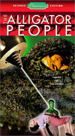 | 新婚旅行中に夫ポールに失踪されてしまった新妻のジェーン(ガーランド)は、僅かな手がかりを元に沼地にある研究所を突き止める。彼女はそこで出会ったシンクレア博士より、ポールが交通事故で受けた傷を治すため、ワニの体液を注入されていたと言う事実を知らされる。しかし、治療の副作用で徐々にワニと化すポール…最後の方法としてギリギリまで放射線を当てると言う治療がなされるのだが… その手の映画の記事などでは結構紹介されることの多いワニ人間。人間の体にワニの頭が載っていると言う愛敬のある姿のスチールを見たと言う人も多いと思うのだが、実際に動いているのを見ると…うーん。「ウルトラQ」の話の一編って感じの作品で、出来そのものも今ひとつ。 ラストにほんのちょっとしか登場しないワニ人間はラバースーツが見え見えで、頭以外は完全に人間。それも逃げ回っている内に沼にはまっておだぶつという展開。造形そのものは結構微笑ましいんだから、それを演技でフォローして欲しかったな。 むしろ徐々に変化していく夫を甲斐甲斐しく見守るガーランドや、ワニに手首を食いちぎられ、奇行を繰り返す男を演じたチャイニーJrの方がキャラとしては立っていた。 |